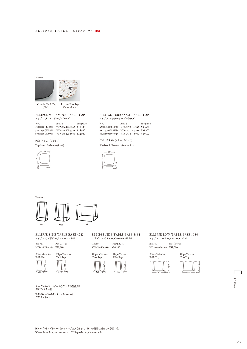 VTL-016 エリプス ローテーブルベース VTS-024 エリプス サイドテーブルベース VTA-046 エリプスメラミンテーブルトップ